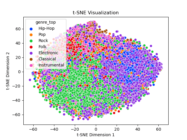 Summary: By analyzing acoustic properties (500 individual characteristics for each sample) extracted from half-minute snippets of over 100,000 tracks sourced from the Free Music Archive, I experimented with several machine-learning classifiers to predict the corresponding music genre. The dataset was notably imbalanced, therefore, to rectify this, I employed the Synthetic Minority Oversampling Technique (SMOTE) to rebalance the data for the best-performing model, which was a neural network. After applying these techniques, the model exhibited a weighted F-1 score of 0.65 across 9 unique genres.