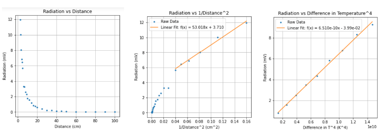 Summary: The characteristics of thermal radiation were examined using a Boltzmann lamp, Leslie cube, and radiation sensor. The experiments assessed emissivity of various coatings, the relationship between radiation intensity and distance, and verified the Stefan-Boltzmann power law at low temperatures. Findings confirmed that radiation intensity adheres to the inverse square law beyond 10 cm, and at low temperatures, intensity is proportional to temperature raised to the fourth power.